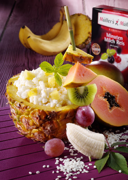 Die Milch erhitzen, den Minuten Milchreis in die kochende Milch einrühren und bei mittlerer Hitze 5 Minuten kochen lassen, dabei häufiger umrühren. Die Ananas quer halbieren, einen Teil des Fruchtfleisches herauslösen und in kleine Stücke schneiden. Nach Beendigung der Kochzeit Ananasstücke und Kokosraspel unter den Milchreis heben. Den Milchreis mit geschlossenem Deckel auf der noch warmen Herdplatte weitere 10 Minuten ausquellen lassen und danach mit Fruchtzucker süßen. Die Ananashälften mit dem Ananas-Kokos-Milchreis füllen. Für die Fruchtspieße das Obst in große Stücke schneiden, abwechselnd auf vier große Spieße stecken und mit dem Milchreis servieren.